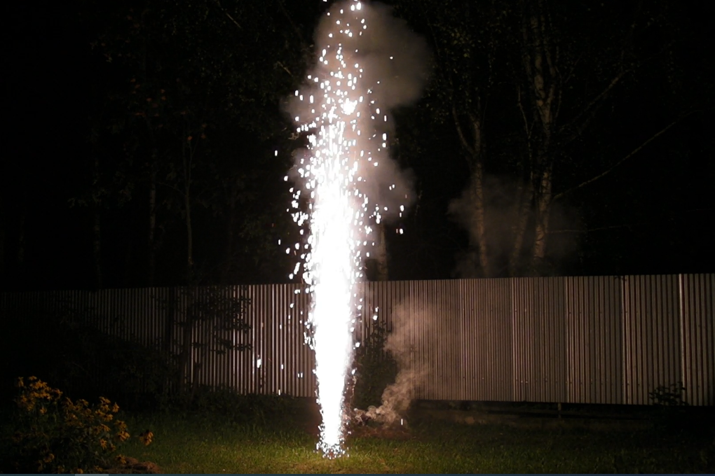 На мой вкус продолжительность фонтана менее 30 сек не есть гуд. Пытаюсь получить фонтан на ПМ с нужной продолжительностью. На данный момент получилось достичь 27 сек для фонтана с шашкой диаметром 20 мм длинной 165 мм составом 64НК+20С+16S++40FeTi++4МаслоИ5А. Повлияла добавка масла.